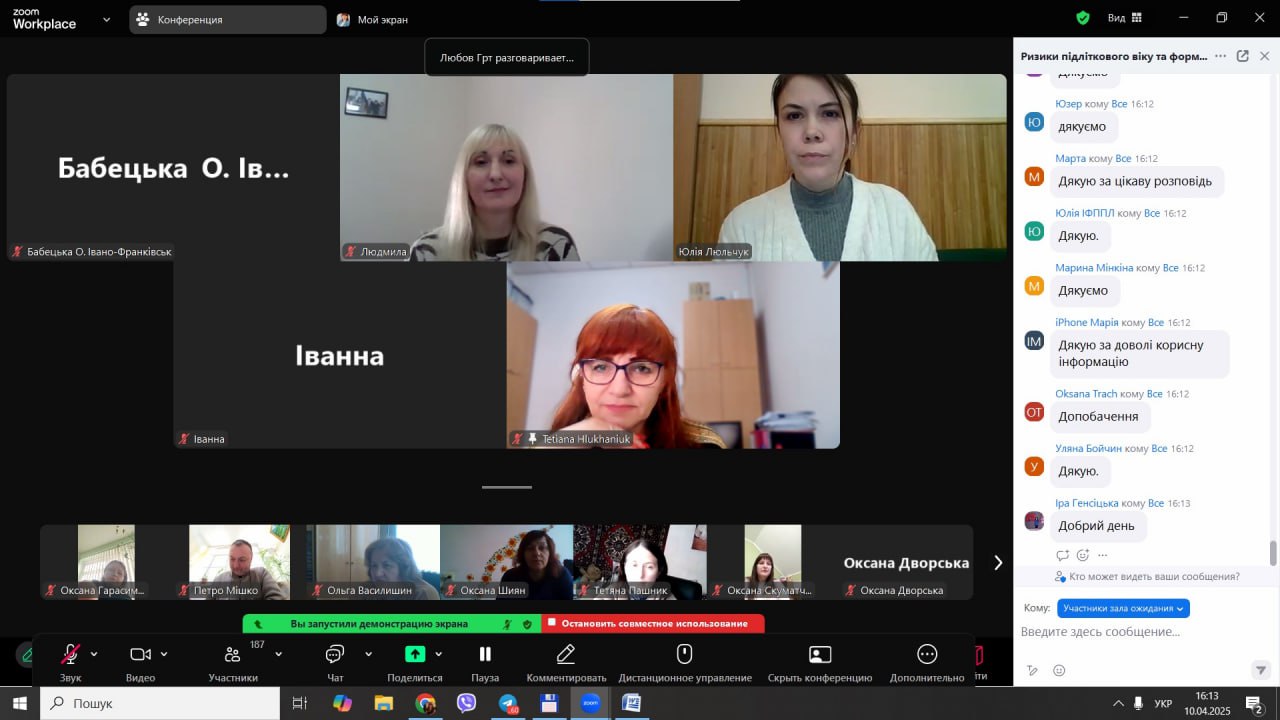 З метою запобігання правопорушень і формування відповідальної поведінки здобувачів освіти 10 квітня 2025 року методисти ОЦППСР Людмила Галайко і Тетяна Глуханюк провели вебінар для соціальних педагогів закладів освіти області на тему: “Ризики підліткового віку та формування відповідальної поведінки молоді”.